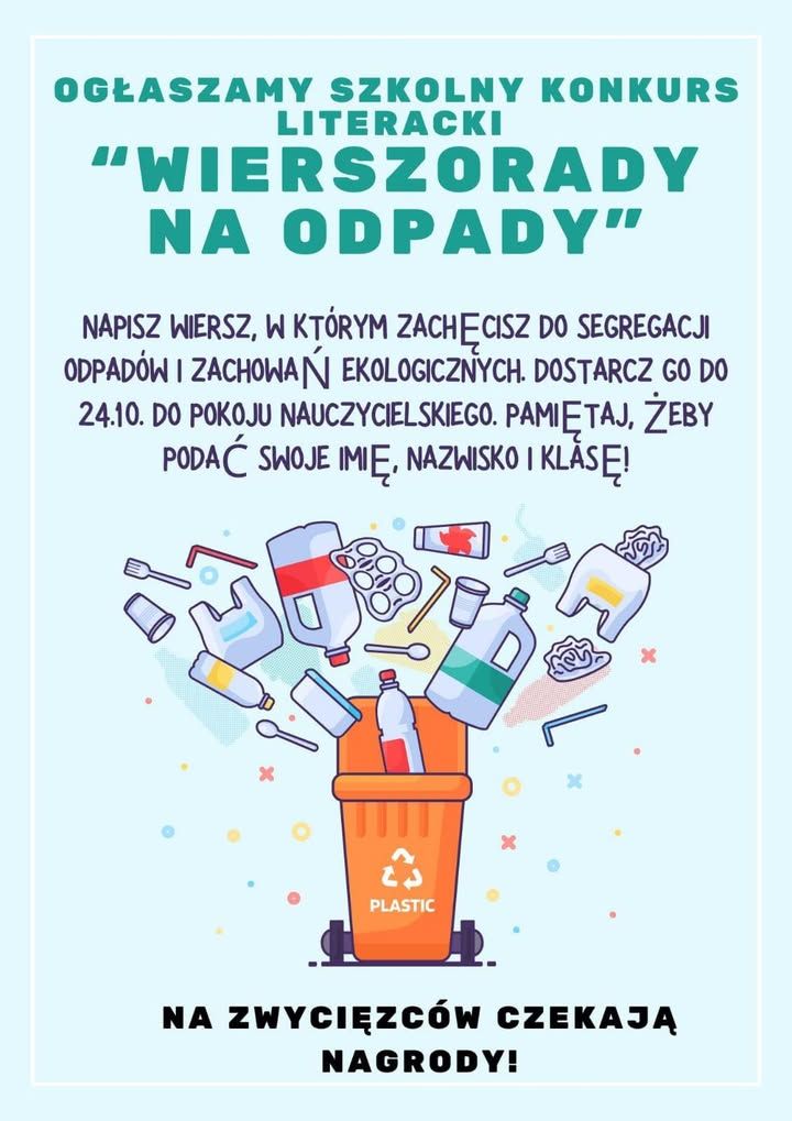 Zapraszamy do udziału w szkolnym konkursie literackim Wierszorady na odpady ! ️ ️ Więcej na Facebooku Szkoły!