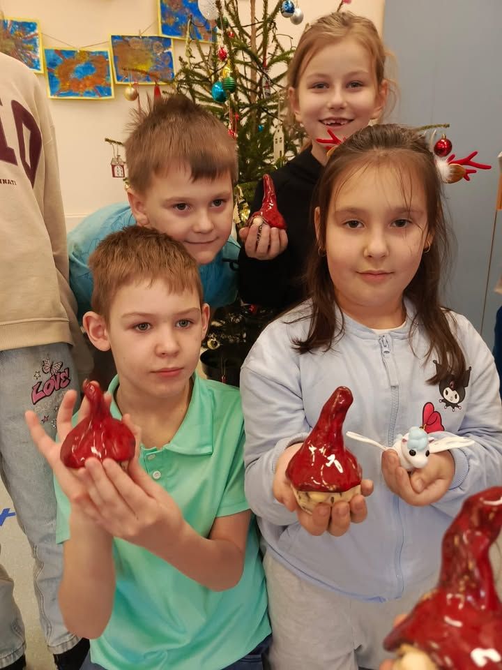 Uczniowie klas 1 3 z dumą przedstawiają swoje zimowe skrzaty wykonane podczas warsztatów ceramicznych prowadzonych w naszej szkole przez p. Agnieszkę Kijewską.