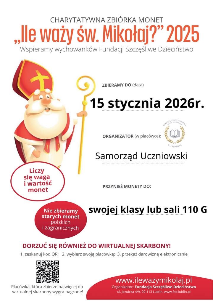 Nasza szkoła bierze udział w ogólnopolskiej akcji Ile waży święty Mikołaj? , organizowanej przez Fundację Szczęśliwe Dzieciństwo.