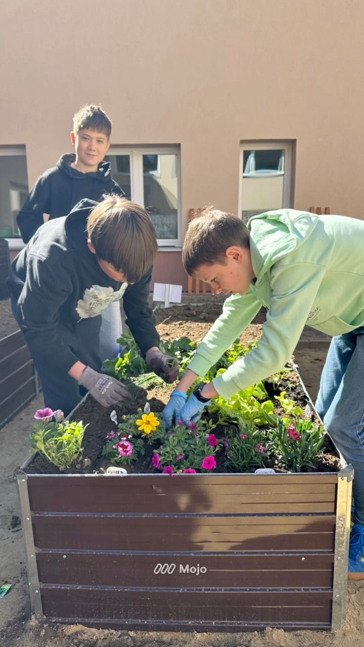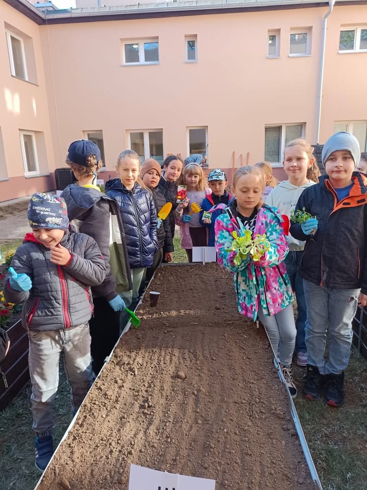 Z okazji Dnia Ziemi uczniowie klasy 6b postanowili zasadzić kwiaty, owoce i zioła na klasowej rabatce w szkolnym ogródku.